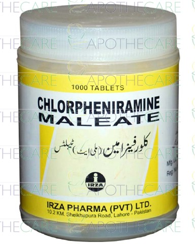 Product Name: Chlorpheniramine Maleate Tab 4mg 1x1000'sProduct Form: TabletPack Size: 1x1000'sMarketed By: IRZA PHARMA PVT LTDGeneric Category: ANTI-HISTAMINEIngredients: Chlorpheniramine Maleate