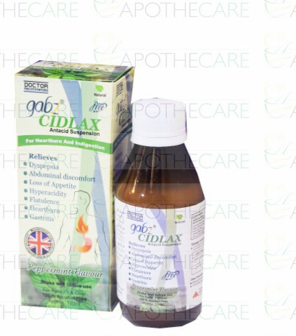 "Product Name: Cidlax Peppermint Flavour Antacid Susp 120mlProduct Form: SuspensionPack Size: 120mlGeneric Category: AntacidIngredients: Each 5ml (Approx.): Glycyrrhiza Glabra – 50mg Zingiber Officinale – 60mg Carum Carvi – 60mg Valeriana Officinais – 50mg Discorea Villosa – 60mg "