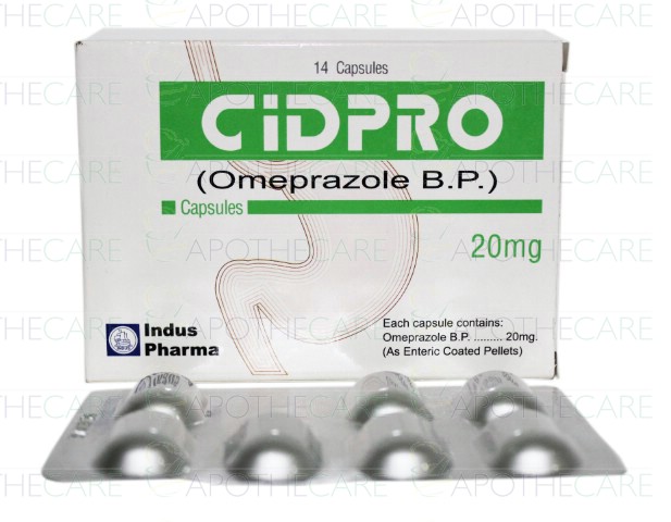 Product Name: Cidpro Cap 20mg 14'sProduct Form: CapsulesPack Size: 14'sMarketed By: INDUS PHARMA (PVT) LTDGeneric Category: Anti-UlcerantIngredients: Omeprazole