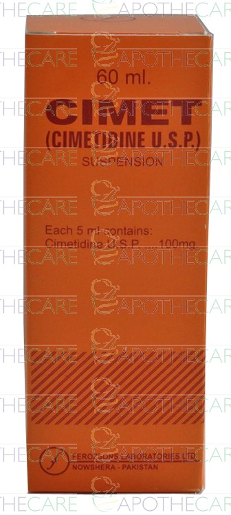 Product Name: CIMET Susp 100mg/5ml 60mlProduct Form: SuspensionPack Size: 60mlMarketed By: FEROZSONS LABORATORIES LTDGeneric Category: Anti-ulcerantIngredients: Cimetidine
