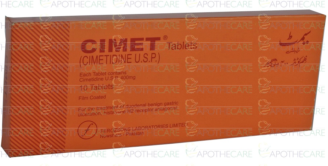 Product Name: Cimet Tab 400mg 10'sProduct Form: TabletsPack Size: 10'sMarketed By: FEROZSONS LABORATORIES LTDGeneric Category: Anti-ulcerantIngredients: Cimetidine