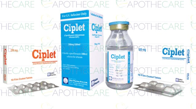 Product Name: Ciplet Tab 500mg 10'sProduct Form: TabletPack Size: 10'sMarketed By: INDUS PHARMA (PVT) LTDGeneric Category: QUINOLONE ANTI-BACTERIALIngredients: Ciprofloxacin Hydrochloride