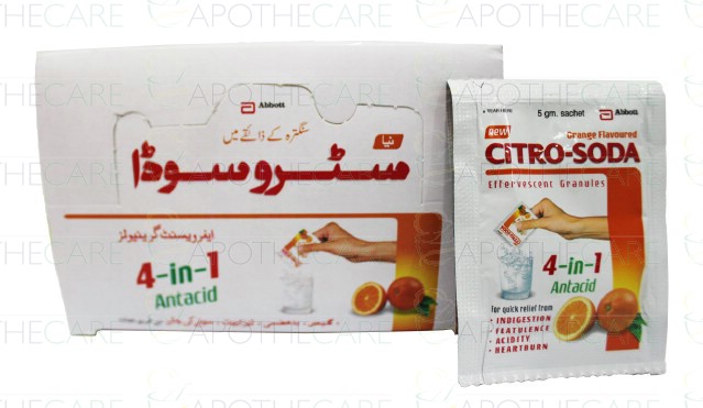 Product Form: PowderPack Size: 20'sMarketed By: Abbot Laboratories (Pakistan) LtdGeneric Category: AntacidIngredients: Sodium Bicarbonate 1.716gm, Sodium Citrate 0.613gm, Citric Acid 0.702gm, Tartaric Acid 0.858gm