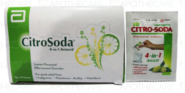 Product Name: Citro Soda Powder Sachet 5g 20'sProduct Form: PowderPack Size: 20'sMarketed By: Abbot Laboratories (Pakistan) LtdGeneric Category: AntacidIngredients: Sodium Bicarbonate 1.716gm, Sodium Citrate 0.613gm, Citric Acid 0.702gm, Tartaric Acid 0.858gm