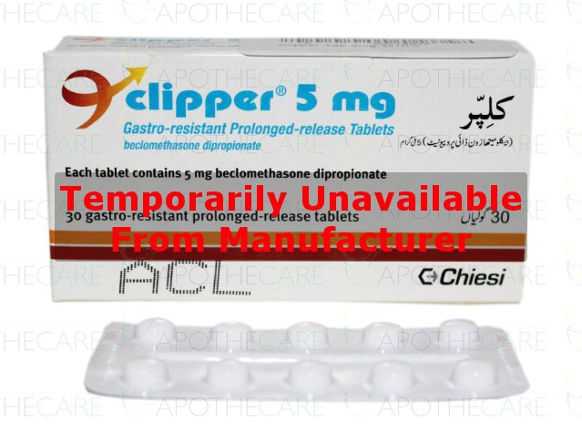 Product Name: Clipper Tab 5mg 3x10's FOCProduct Form: TabletPack Size: 3x10'sMarketed By: Chiesi Pharmaceuticals (Pvt) LtdGeneric Category: Anti-inflammatory + CorticosteroidsIngredients: Beclomethasone Dipropionate