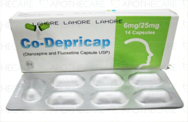 Product Name: Co-Depricap Cap 6mg/25mg 14'sProduct Form: CapsulesPack Size: 14'sMarketed By: Nabiqasim Industries (Pvt) ltdGeneric Category: Anti-psychoticIngredients: Olanzapine 6mg, Fluoxetine 25mg