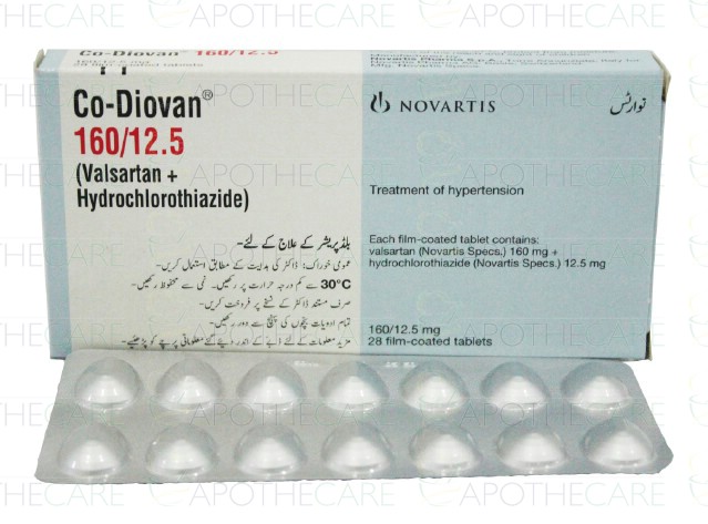 Product Name: Co-Diovan Tab 160mg/12.5mg 28'sProduct Form: TabletsPack Size: 28'sMarketed By: NOVARTIS PHARMA PAKISTAN LTDGeneric Category: Anti-HypertensiveIngredients: Valsartan 160mg , Hydrochlorothiazide 12.5mg