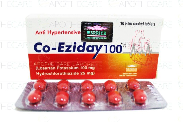 Product Name: Co-Eziday Tab 100mg/25mg 10'sProduct Form: TabletsPack Size: 10'sMarketed By: Werrick PharmaceuticalsGeneric Category: Anti-HypertensiveIngredients: Losartan Potassium 100mg, Hydrochlorothiazide 25mg