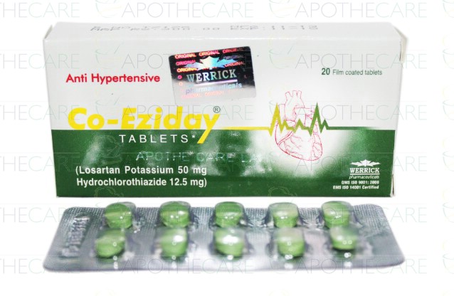 Product Name: Co-Eziday Tab 50mg/12.5mg 10'sProduct Form: TabletsPack Size: 10'sMarketed By: Werrick PharmaceuticalsGeneric Category: Anti-HypertensiveIngredients: Losartan Potassium 50mg, Hydrochlorothiazide 12.5mg