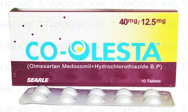 Product Name: Co-Olesta Tab 40mg/12.5mg 10'sProduct Form: TabletsPack Size: 10'sMarketed By: SEARLE PAKISTAN Generic Category: Anti-HypertensiveIngredients: Olmesartan Medoximil 40mg,Hydrochlorthiazide 12.5mg
