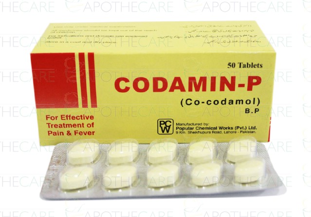 Product Name: Codamin-P Tab 500mg/15mg 5x10'sProduct Form: TabletsPack Size: 5x10'sMarketed By: Popular Chemical Work(Pvt) LtdGeneric Category: Fever and Pain reliefIngredients: Paracetamol 500mg,Codeine Phosphate 15mg