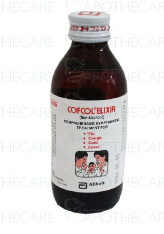 Product Name: Cofcol Elix 120mlProduct Form: ElixirPack Size: 120mlMarketed By: ABBOTT LABORATORIES (PAKISTAN) LTDGeneric Category: Cold preparation without Anti-infectives Ingredients: Each 15ml contains: Paracetamol 325mg,Pseudoephedrine HCl 30mg,Chlorpheniramine maleate 1mg,Dextromethorphan HBr 10mg,Vitamin C 50mg