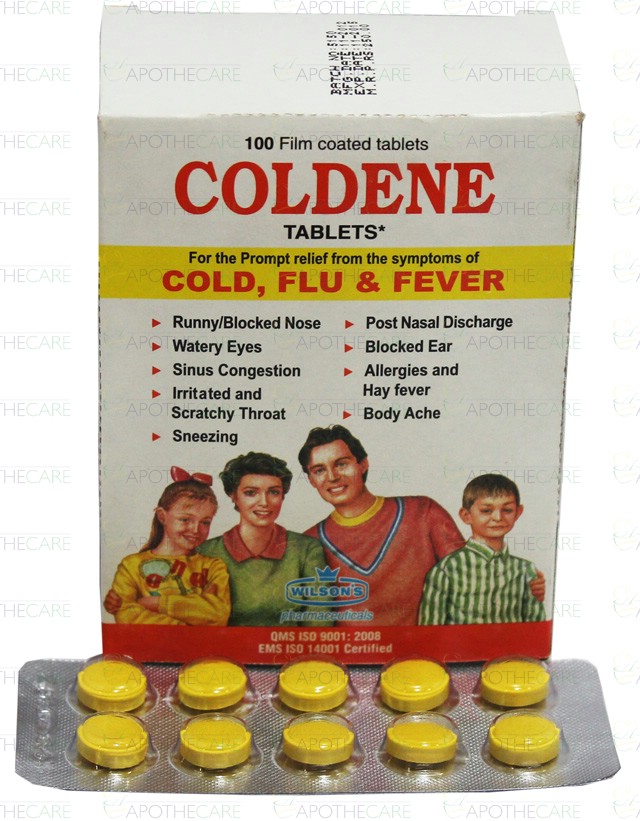 Product Name: Coldene Tab 10x10'sProduct Form: TabletsPack Size: 10x10'sMarketed By: WILSON'S PHARMACEUTICALSGeneric Category: Cough SuppressantIngredients: Paracetamol 250mg, Pseudoephedrine 15mg, Mepyramine Maleate 6.5mg, Pheniramine Maleate 6.5mg