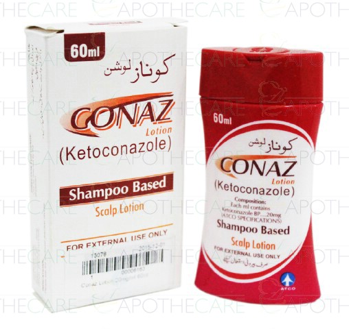 Product Name: Conaz Lotion 60mlProduct Form: LotionPack Size: 60mlMarketed By: ATCO LABORATORIES (PVT) LTDGeneric Category: Anti-Fungal Ingredients: Each ml contains: Ketoconazole 20mg