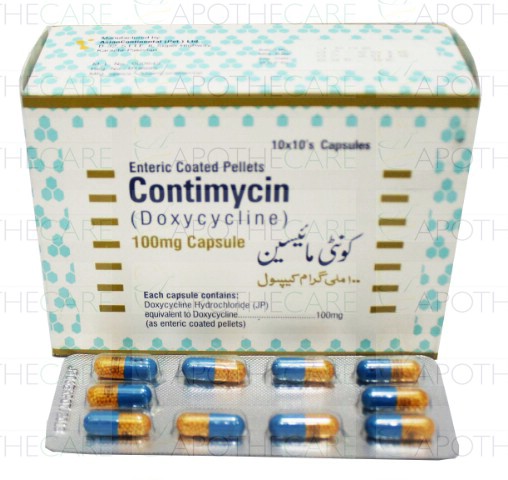 Product Name: Contimycin Cap 100mg 100'sProduct Form: CapsulesPack Size: 100's:Marketed By: CONTINENTAL CHEMICAL Co. (PVT) LTDGeneric Category: TETRACYCLINE ANTI-BACTERIAL Ingredients: Doxycycline (as Hyclate)