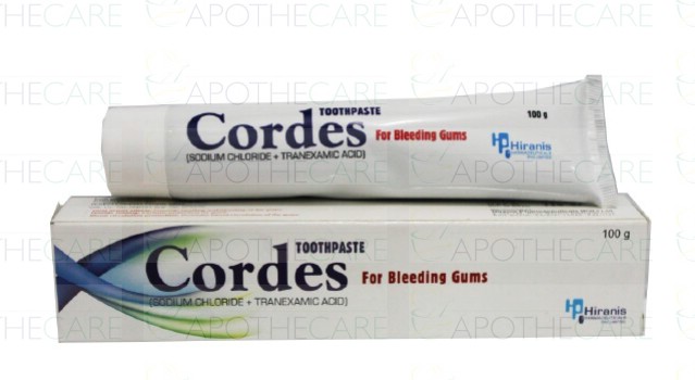 Product Name: Cordes Toothpaste 100gProduct Form:Paste Pack Size: 100gGeneric Category: Oral HygieneIngredients: Sodium chloride 16%, Tranexamic Acid 0.05%