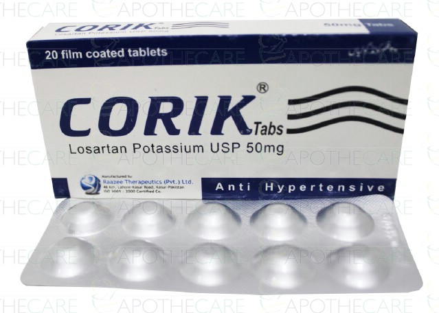Product Name: Corik Tab 50mg 20'sProduct Form: TabletsPack Size: 20'sMarketed By: RAAZEE THERAPEUTICS (PVT )LTDGeneric Category: Anti-HypertensiveIngredients: Losartan Potassium