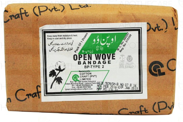 Product Name: Cotton Bandage 5cmx5m 1'sProduct Form: Open Wove Bandage BP-Type 2Pack Size: 1'sMarketed By: COTTON CRAFT (PVT) LTDGeneric Category: Surgical Products