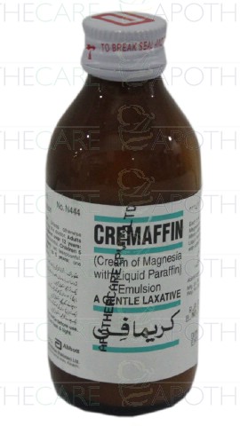 Product Name: Cremaffin Emulsion 120mlProduct Form: EmulsionPack Size: 120mlMarketed By: ABBOTT LABORATORIES (PAKISTAN) LTDGeneric Category: CONSTIPATION RELIEF Ingredients: Magnesium Hydroxide Mixture 3.5ml, Liquid Paraffin 1.25ml