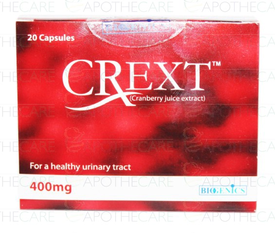 Product Name: Crext Cap 20'sProduct Form: CapsulesPack Size: 20'sMarketed By: Biogenics Pakistan Pvt Ltd.Generic Category: Anti-BacterialIngredients: Cranberry juice extract