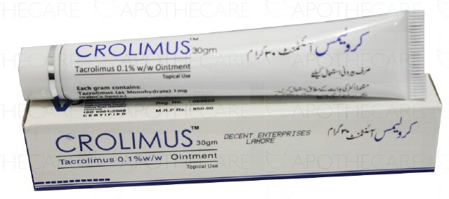 Product Name: Crolimus Oint 0.1% 30gProduct Form: OintmentPack Size: 30gMarketed By: VALOR PHARMACEUTICALSGeneric Category: Anti-EczemaIngredients: Tacrolimus Monohydrate