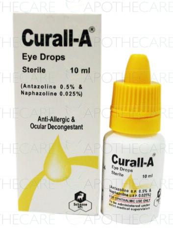 Product Name: Curall A Eye Drops 10mlProduct Form: DropsPack Size: 10mlMarketed By: SCHAZOO PHARMACEUTICALS (PVT) LTDGeneric Category: Anti-AllergicIngredients: Naphazoline 0.025%, Antazoline 0.5%
