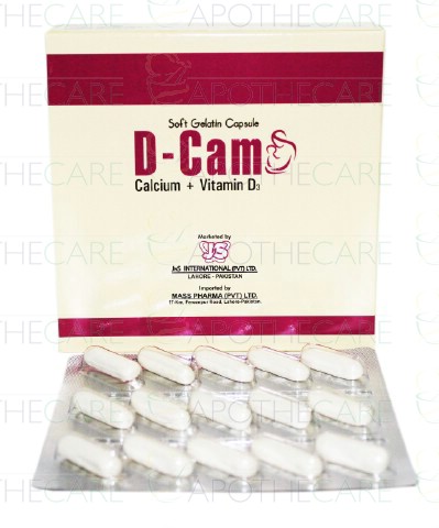 Product Name: D-Cam Soft Gelatin Cap 2x15'sProduct Form: CapsulesPack Size: 2x15'sMarketed By: Mass Pharma (Pvt) Ltd Generic Category: Calcium SupplementIngredients: Calcium 600mg , Vitamin D3 200IU