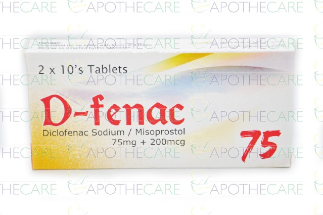 Product Name: D-Fenac Tab 75mg/200mcg 2x10'sProduct Form: TabletsPack Size: 2x10'sMarketed By: MASS PHARMAGeneric Category: NSAID / ProstaglandinsIngredients: Diclofenac Sodium 75mg, Misoprostol 200mcg