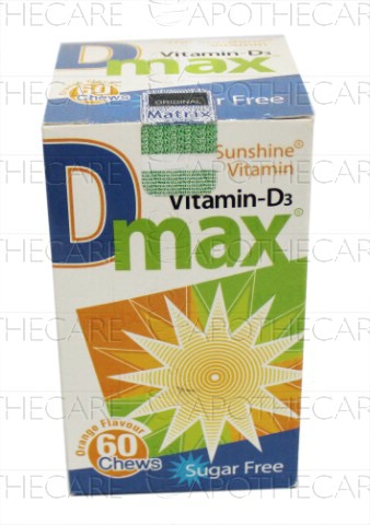 Product Name: D-Max Chewable Tab 2000IU 60'sProduct Form: TabletsPack Size: 60'sMarketed By: Matrix Pharma (Pvt) LtdGeneric Category: Vitamin-D AnalogueIngredients: Vitamin D3 (Cholecalciferol)