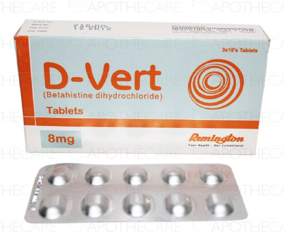 Product Name: D-Vert Tab 8mg 3x10'sProduct Form: Tablets Pack Size: 3x10'sMarketed By: Remington PharmaceuticalsGeneric Category: Anti-VertigoIngredients: Betahistine Dihydrochloride