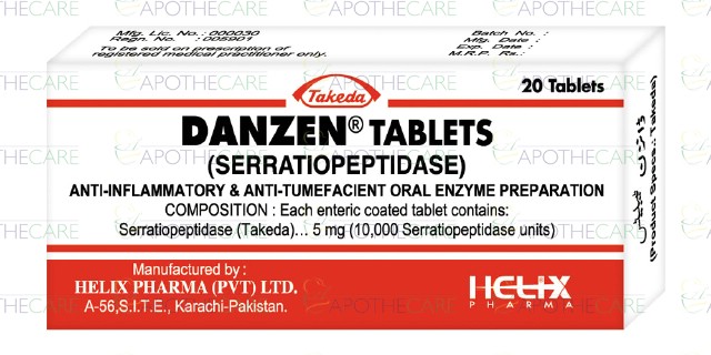 Product Name: Danzen Tab 5mg 20'sProduct Form: TabletsPack Size: 20'sMarketed By: Helix Pharma (Pvt) LtdGeneric Category: Anti-Inflammtory EnzymesIngredients: Serratiopeptidase