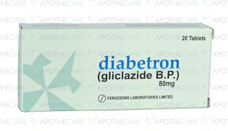 Product Name: Diabetron Tab 80mg 20'sProduct Form: TabletPack Size: 20'sMarketed By: FEROZSONS LABORATORIES LTDGeneric Category: ORAL HYPOGLYCEMIC Ingredients: Gliclazide