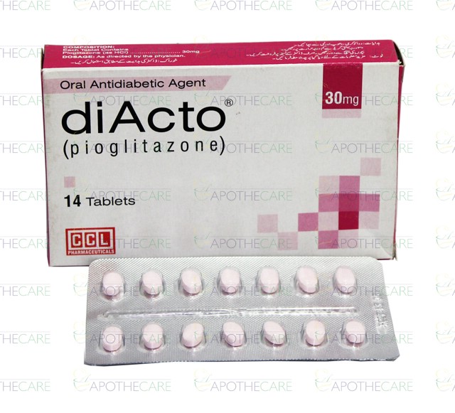 Product Name: Diacto Tab 30mg 14'sProduct Form: TabletsPack Size: 14'sMarketed By: CCL PharmaceuticalsGeneric Category: Oral HypoglycemicIngredients: Pioglitazone