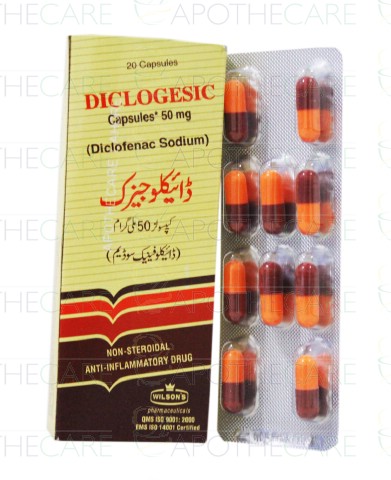 Product Name: Diclogesic Cap 50mg 2x10'sProduct Form: CapsulesPack Size: 2x10'sMarketed By: WILSON'S PHARMACEUTICALSGeneric Category: NSAIDIngredients: Diclofenac Sodium