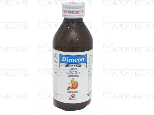 Product Name: Dimeco Susp 120mlProduct Form: SuspensionPack Size: 120mlMarketed By: MACTER INTERNATIONAL (PVT) LTD Generic Category: Antacid with anti-flatulantIngredients: Each 5ml contains: Aluminum Hydroxide 215mg,Magnesium Hydroxide 80mg,Simethicone 25mg