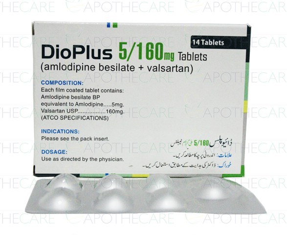 Product Name: DIOPLUS Tab 5mg/160mg 14'sProduct Form: TabletsPack Size: 14'sMarketed By: ATCO LABORATORIES (PVT) LTDGeneric Category: Anti-Hypertensive Ingredients: Amlodipine Besylate 5mg,Valsartan 160mg