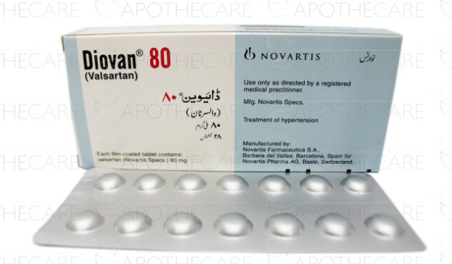 Product Name: Diovan Tab 80mg 28'sProduct Form: TabletsPack Size: 28'sMarketed By: NOVARTIS PHARMA PAKISTAN LTDGeneric Category: Anti-HypertensiveIngredients: Valsartan