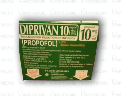 Product Name: Diprivan Inj 200mg 5Ampx20mlProduct Form: InjectionPack Size: 5Ampx20mlMarketed By: ICI PAKISTAN LTD Generic Category: General AnestheticsIngredients: Propofol
