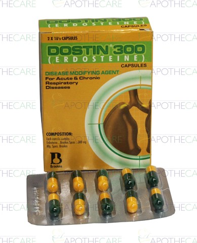 Product Name: Dostin Cap 300mg 2x10'sProduct Form: CapsulesPack Size: 2x10'sMarketed By: BROOKES PHARMACEUTICAL LABS (PAKISTAN) LTDGeneric Category: ExpectorantIngredients: Erdosteine