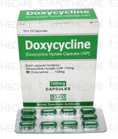 Product Name: Doxycycline Cap 100mg 10x10'sProduct Form: CapsulesPack Size: 10x10'sMarketed By: Zafa PharmaGeneric Category: Tetracycline Anti-BacterialIngredients: Doxycycline Hyclate