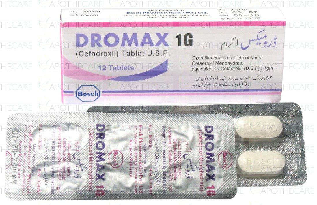 Product Name: Dromax Tab 1gm 2x6'sProduct Form: TabletPack Size: 2x6'sMarketed By: BOSCH PHARMACEUTICALS (PVT) LTDGeneric Category: CEPHALOSPORIN ANTIBIOTICIngredients: Cefadroxil