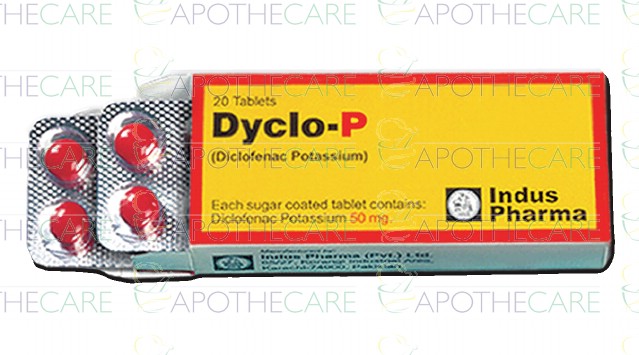 Product Name: Dyclo-P Tab 50mg 20'sProduct Form: TabletPack Size: 20'sMarketed By: INDUS PHARMA (PVT) LTDGeneric Category: NSAIDIngredients: Diclofenac Potassium
