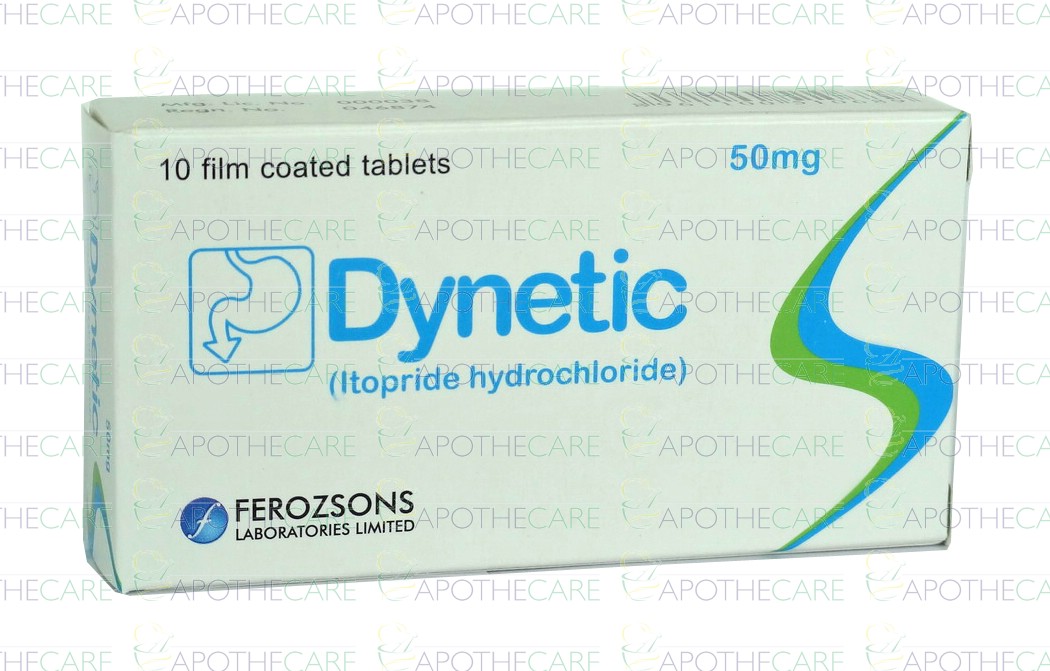 Product Name: Dynetic Tab 50mg 10'sProduct Form: TabletPack Size: 10'sMarketed By: FEROZSONS LABORATORIES LTDGeneric Category: GastroprokineticIngredients: Itopride Hydrochloride