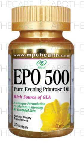 Product Name: EPO 500mg Softgels 30'sProduct Form: SoftgelsPack Size: 30'sMarketed By: MPC Health & FoodGeneric Category: Nutritional Supplement Indications: Evening Primrose Oil 500mg, GLA 9%