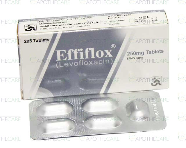 Product Name: Effiflox Tab 250mg 2x5'sProduct Form: TabletsPack Size: 2x5'sMarketed By: SAMI PHARMACEUTICALSGeneric Category: QUINOLONES ANTI-BACTERIALIngredients: Levofloxacin