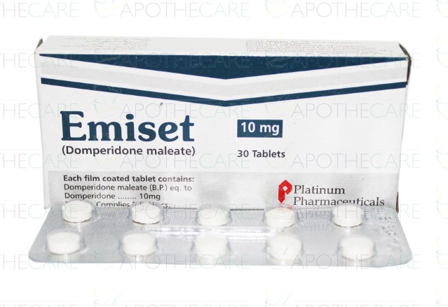 Product Name: Emiset Tab 10mg 30'sProduct Form: TabletPack Size: 3x10'sMarketed By: Platinum Pharmaceuticals (Pvt) LtdGeneric Category: GASTROPROKINETICIngredients: Domperidone Maleate