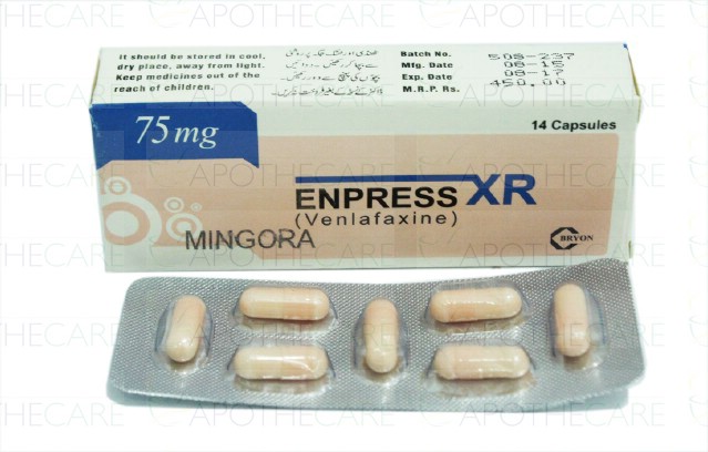 Product Name: Enpress XR Cap 75mg 2x7'sProduct Form: CapsulesPack Size: 2x7'sMarketed By: Bryon Pharmaceuticals (Pvt) LtdGeneric Category: Anti-DepressantIngredients: Venlafaxine HCl