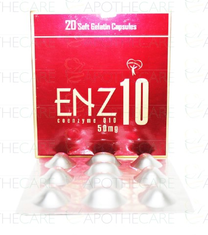 Product Name: Enz10 Cap 50mg 20'sProduct Form: Soft Gelatin CapsulesPack Size: 20's Marketed By: MASS PHARMAGeneric Category: Anti-oxidantIngredients: Co-Enzyme Q10