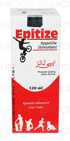 Product Name: Epitize Syp 120mlProduct Form: SyrupPack Size: 120mlMarketed By: HIMONT PHARMA (PVT) LTDGeneric Category: Appetite StimulantIngredients: Each 10ml contains Phyllanthus emblica, Achiliea millefolium, Elettaria cardamomum, Tinospora cordifolia, Tribulus terrestris, terminalia chebula, Cichorium intybus, tamarix gallica, Piper Longum