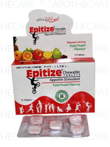 Product Name: Epitize Tutti Frutti Flavour Tab 15'sProduct Form: Chewable TabletsPack Size: 15'SMarketed By: Himont Pharma (Pvt) LtdGeneric Category: Appetite StimulantIngredients: Each tab contains : Achillea millefolium, Cichorium intybus, Cassia occidentalis, Emblica officinalis, piper longum, Tamarix gallica, Tribulus terrestris, Elettaria cardamomum, Capparis spinosa, Boerhaavia diffusa, Tinospora cordifollia, Terminalia chebula